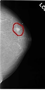FILE: C_0118_1.LEFT_CC.OVERLAY TOTAL_ABNORMALITIES 1 ABNORMALITY 1 LESION_TYPE MASS SHAPE IRREGULAR MARGINS SPICULATED ASSESSMENT 5 SUBTLETY 5 PATHOLOGY MALIGNANT TOTAL_OUTLINES 1 BOUNDARY |