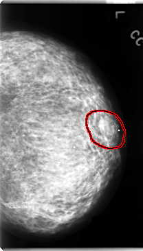 FILE: C_0130_1.LEFT_CC.OVERLAY TOTAL_ABNORMALITIES 1 ABNORMALITY 1 LESION_TYPE MASS SHAPE OVAL MARGINS ILL_DEFINED ASSESSMENT 4 SUBTLETY 3 PATHOLOGY MALIGNANT TOTAL_OUTLINES 1 BOUNDARY |