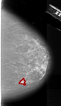 FILE: A_1008_1.RIGHT_CC.OVERLAY TOTAL_ABNORMALITIES 1 ABNORMALITY 1 LESION_TYPE MASS SHAPE IRREGULAR MARGINS ILL_DEFINED ASSESSMENT 4 SUBTLETY 4 PATHOLOGY MALIGNANT TOTAL_OUTLINES 1 BOUNDARY |