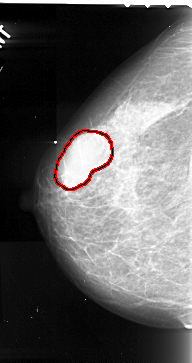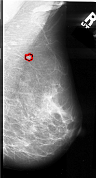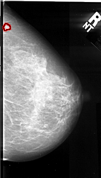 FILE: A_1061_1.LEFT_CC.OVERLAY TOTAL_ABNORMALITIES 1 ABNORMALITY 1 LESION_TYPE MASS SHAPE IRREGULAR MARGINS ILL_DEFINED ASSESSMENT 4 SUBTLETY 2 PATHOLOGY MALIGNANT TOTAL_OUTLINES 1 BOUNDARY |