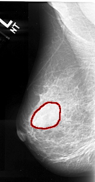 FILE: A_1061_1.RIGHT_CC.OVERLAY TOTAL_ABNORMALITIES 1 ABNORMALITY 1 LESION_TYPE MASS SHAPE LOBULATED MARGINS CIRCUMSCRIBED ASSESSMENT 3 SUBTLETY 5 PATHOLOGY MALIGNANT TOTAL_OUTLINES 1 BOUNDARY |