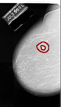 FILE: A_1090_1.LEFT_CC.OVERLAY TOTAL_ABNORMALITIES 1 ABNORMALITY 1 LESION_TYPE MASS SHAPE IRREGULAR MARGINS SPICULATED ASSESSMENT 5 SUBTLETY 4 PATHOLOGY MALIGNANT TOTAL_OUTLINES 2 BOUNDARY CORE |