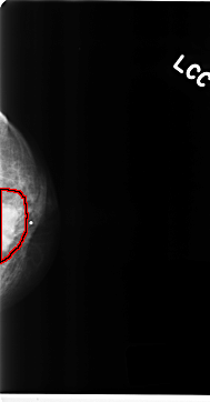 FILE: C_0141_1.LEFT_CC.OVERLAY TOTAL_ABNORMALITIES 1 ABNORMALITY 1 LESION_TYPE MASS SHAPE IRREGULAR MARGINS MICROLOBULATED ASSESSMENT 5 SUBTLETY 5 PATHOLOGY MALIGNANT TOTAL_OUTLINES 1 BOUNDARY |