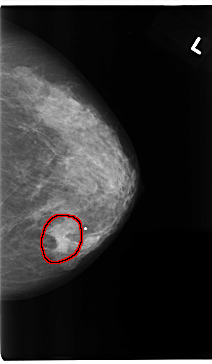 FILE: C_0175_1.LEFT_CC.OVERLAY TOTAL_ABNORMALITIES 1 ABNORMALITY 1 LESION_TYPE MASS SHAPE IRREGULAR MARGINS ILL_DEFINED ASSESSMENT 5 SUBTLETY 4 PATHOLOGY MALIGNANT TOTAL_OUTLINES 1 BOUNDARY |
