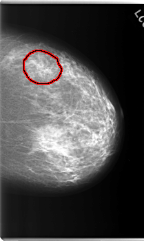 FILE: C_0207_1.LEFT_MLO.OVERLAY TOTAL_ABNORMALITIES 1 ABNORMALITY 1 LESION_TYPE CALCIFICATION TYPE PLEOMORPHIC DISTRIBUTION CLUSTERED LESION_TYPE MASS SHAPE IRREGULAR MARGINS ILL_DEFINED ASSESSMENT 4 SUBTLETY 3 PATHOLOGY MALIGNANT TOTAL_OUTLINES 1 BOUNDARY |