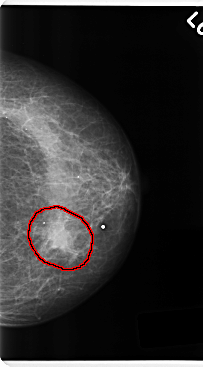 FILE: C_0216_1.LEFT_CC.OVERLAY TOTAL_ABNORMALITIES 1 ABNORMALITY 1 LESION_TYPE MASS SHAPE IRREGULAR MARGINS ILL_DEFINED ASSESSMENT 5 SUBTLETY 5 PATHOLOGY MALIGNANT TOTAL_OUTLINES 1 BOUNDARY |