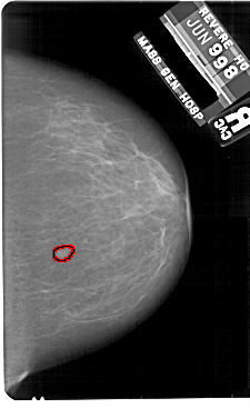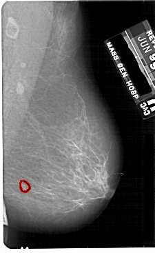 FILE: A_1816_1.RIGHT_CC.OVERLAY TOTAL_ABNORMALITIES 1 ABNORMALITY 1 LESION_TYPE MASS SHAPE IRREGULAR MARGINS ILL_DEFINED LESION_TYPE CALCIFICATION TYPE PUNCTATE DISTRIBUTION CLUSTERED ASSESSMENT 4 SUBTLETY 2 PATHOLOGY MALIGNANT TOTAL_OUTLINES 1 BOUNDARY |