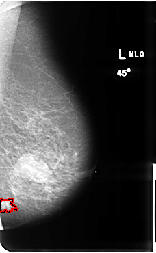 FILE: B_3512_1.LEFT_CC.OVERLAY TOTAL_ABNORMALITIES 1 ABNORMALITY 1 LESION_TYPE CALCIFICATION TYPE PLEOMORPHIC DISTRIBUTION CLUSTERED LESION_TYPE MASS SHAPE IRREGULAR-ARCHITECTURAL_DISTORTION MARGINS SPICULATED ASSESSMENT 5 SUBTLETY 4 PATHOLOGY MALIGNANT TOTAL_OUTLINES 1 BOUNDARY |