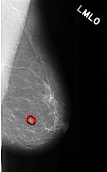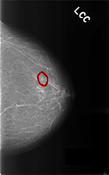 FILE: C_0303_1.LEFT_CC.OVERLAY TOTAL_ABNORMALITIES 1 ABNORMALITY 1 LESION_TYPE MASS SHAPE LOBULATED MARGINS CIRCUMSCRIBED ASSESSMENT 3 SUBTLETY 4 PATHOLOGY BENIGN TOTAL_OUTLINES 1 BOUNDARY |