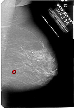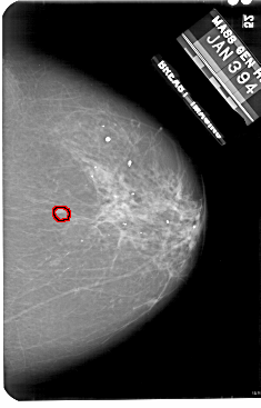 FILE: A_1901_1.RIGHT_CC.OVERLAY TOTAL_ABNORMALITIES 1 ABNORMALITY 1 LESION_TYPE MASS SHAPE IRREGULAR MARGINS ILL_DEFINED ASSESSMENT 4 SUBTLETY 5 PATHOLOGY MALIGNANT TOTAL_OUTLINES 1 BOUNDARY |